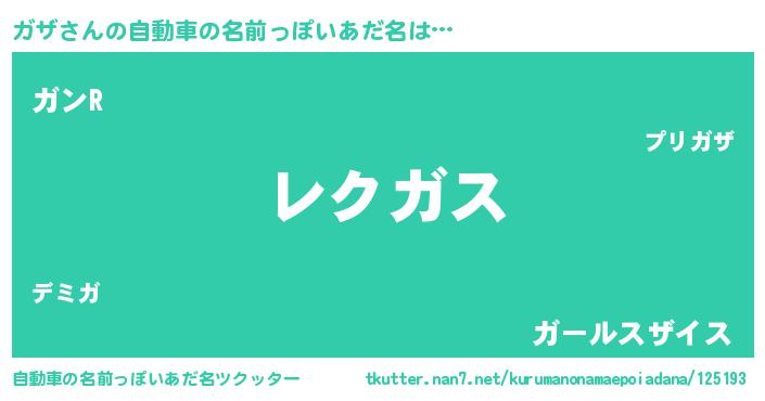 ガザさんの自動車の名前っぽいあだ名は… 『レクガス』『ガンR』『ガールスザイス』 ツクッター #自動車の名前っぽいあだ名ツクッター http://tkutter.nan7.net/kurumanonamaepoiadana/125193/