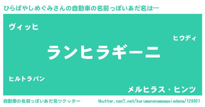 ひらばやしめぐみさんの自動車の名前っぽいあだ名は… 『ランヒラギーニ』『ヴィッヒ』『メルヒラス・ヒンツ』 ツクッター #自動車の名前っぽいあだ名ツクッター http://tkutter.nan7.net/kurumanonamaepoiadana/126031/