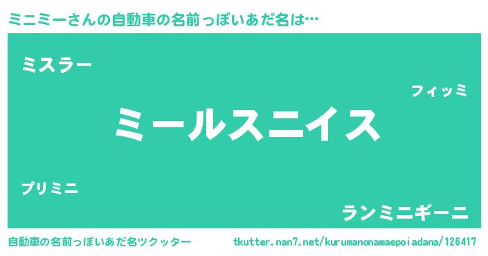 ミニミーさんの自動車の名前っぽいあだ名は… 『ミールスニイス』『ミスラー』『ランミニギーニ』 ツクッター #自動車の名前っぽいあだ名ツクッター http://tkutter.nan7.net/kurumanonamaepoiadana/126417/