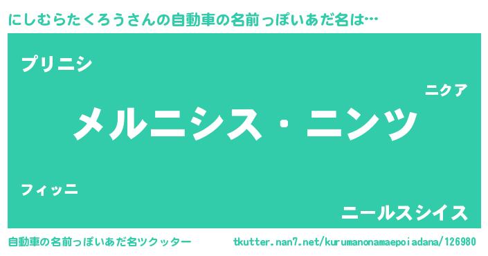 | 男性向けラノベタイトル風あだ名 | 『Re:にしむらたくろうから始める異世界生活』 |