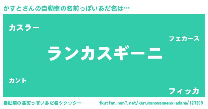 かすとさんの自動車の名前っぽいあだ名は… 『ランカスギーニ』『カスラー』『フィッカ』 ツクッター #自動車の名前っぽいあだ名ツクッター http://tkutter.nan7.net/kurumanonamaepoiadana/127209/