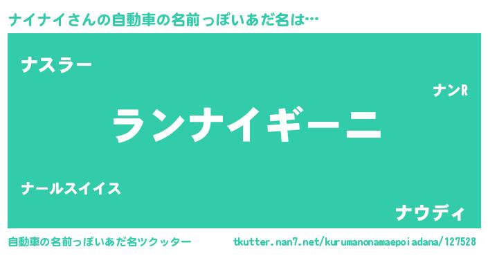 ナイナイさんの自動車の名前っぽいあだ名は… 『ランナイギーニ』『ナスラー』『ナウディ』 ツクッター #自動車の名前っぽいあだ名ツクッター http://tkutter.nan7.net/kurumanonamaepoiadana/127528/
