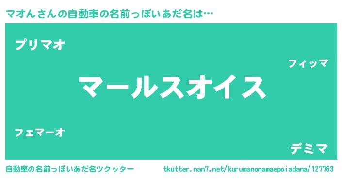 マオんさんの自動車の名前っぽいあだ名は… 『マールスオイス』『プリマオ』『デミマ』 ツクッター #自動車の名前っぽいあだ名ツクッター http://tkutter.nan7.net/kurumanonamaepoiadana/127763/