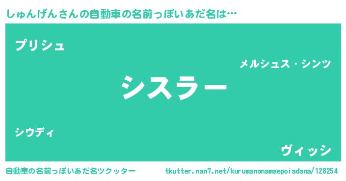 しゅんげんさんの自動車の名前っぽいあだ名は… 『シスラー』『プリシュ』『ヴィッシ』 ツクッター #自動車の名前っぽいあだ名ツクッター http://tkutter.nan7.net/kurumanonamaepoiadana/128254/