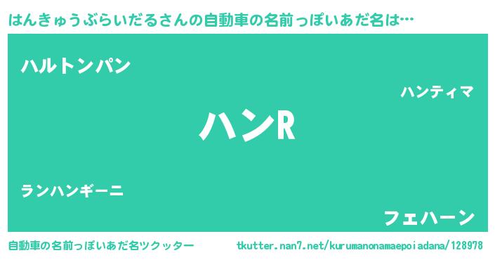 はんきゅうぶらいだるさんの自動車の名前っぽいあだ名は… 『ハンR』『ハルトンパン』『フェハーン』 ツクッター #自動車の名前っぽいあだ名ツクッター http://tkutter.nan7.net/kurumanonamaepoiadana/128978/
