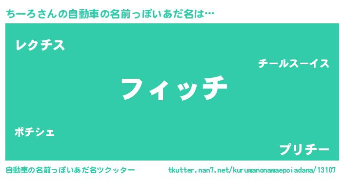 ちーろさんの自動車の名前っぽいあだ名は… 『フィッチ』『レクチス』『プリチー』 ツクッター #自動車の名前っぽいあだ名ツクッター http://tkutter.nan7.net/kurumanonamaepoiadana/13107/