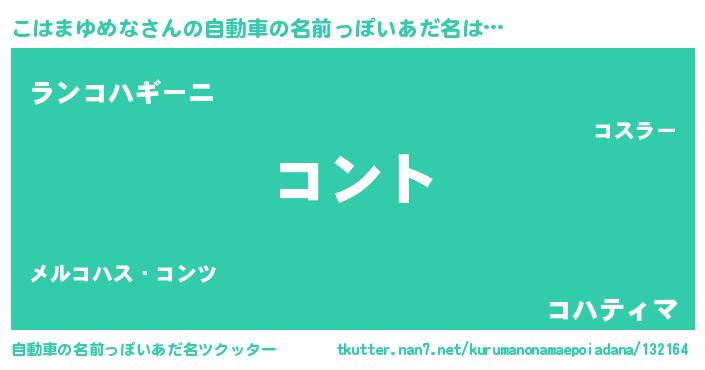 こはまゆめなさんの自動車の名前っぽいあだ名は… 『コント』『ランコハギーニ』『コハティマ』 ツクッター #自動車の名前っぽいあだ名ツクッター http://tkutter.nan7.net/kurumanonamaepoiadana/132164/