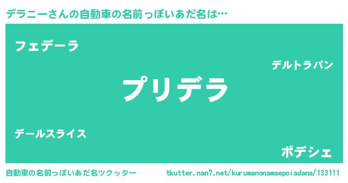 デラニーさんの自動車の名前っぽいあだ名は… 『プリデラ』『フェデーラ』『ポデシェ』 ツクッター #自動車の名前っぽいあだ名ツクッター http://tkutter.nan7.net/kurumanonamaepoiadana/133111/