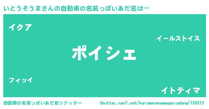 いとうそうまさんの自動車の名前っぽいあだ名は… 『ポイシェ』『イクア』『イトティマ』 ツクッター #自動車の名前っぽいあだ名ツクッター http://tkutter.nan7.net/kurumanonamaepoiadana/135613/