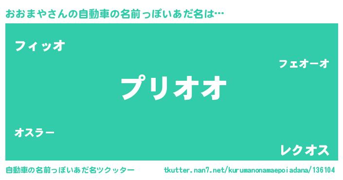 おおまやさんの自動車の名前っぽいあだ名は… 『プリオオ』『フィッオ』『レクオス』 ツクッター #自動車の名前っぽいあだ名ツクッター http://tkutter.nan7.net/kurumanonamaepoiadana/136104/