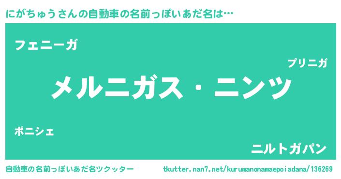にがちゅうさんの自動車の名前っぽいあだ名は… 『メルニガス・ニンツ』『フェニーガ』『ニルトガパン』 ツクッター #自動車の名前っぽいあだ名ツクッター http://tkutter.nan7.net/kurumanonamaepoiadana/136269/