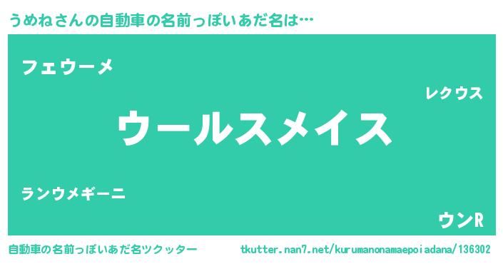 うめねさんの自動車の名前っぽいあだ名は… 『ウールスメイス』『フェウーメ』『ウンR』 ツクッター #自動車の名前っぽいあだ名ツクッター http://tkutter.nan7.net/kurumanonamaepoiadana/136302/