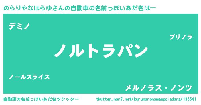 のらりやなはらゆさんの自動車の名前っぽいあだ名は… 『ノルトラパン』『デミノ』『メルノラス・ノンツ』 ツクッター #自動車の名前っぽいあだ名ツクッター http://tkutter.nan7.net/kurumanonamaepoiadana/136541/