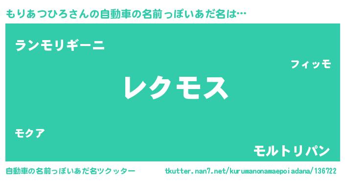 もりあつひろさんの自動車の名前っぽいあだ名は… 『レクモス』『ランモリギーニ』『モルトリパン』 ツクッター #自動車の名前っぽいあだ名ツクッター http://tkutter.nan7.net/kurumanonamaepoiadana/136722/
