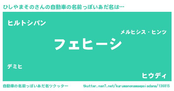 ひしやまそのさんの自動車の名前っぽいあだ名は… 『フェヒーシ』『ヒルトシパン』『ヒウディ』 ツクッター #自動車の名前っぽいあだ名ツクッター http://tkutter.nan7.net/kurumanonamaepoiadana/136815/