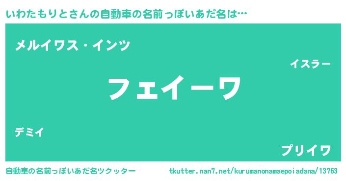 いわたもりとさんの自動車の名前っぽいあだ名は… 『フェイーワ』『メルイワス・インツ』『プリイワ』 ツクッター #自動車の名前っぽいあだ名ツクッター http://tkutter.nan7.net/kurumanonamaepoiadana/13763/