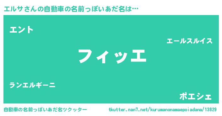 エルサさんの自動車の名前っぽいあだ名は… 『フィッエ』『エント』『ポエシェ』 ツクッター #自動車の名前っぽいあだ名ツクッター http://tkutter.nan7.net/kurumanonamaepoiadana/13829/