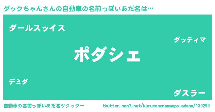 | 男性向けラノベタイトル風あだ名 | 『この素晴らしい世界にダックちゃんを!』 |