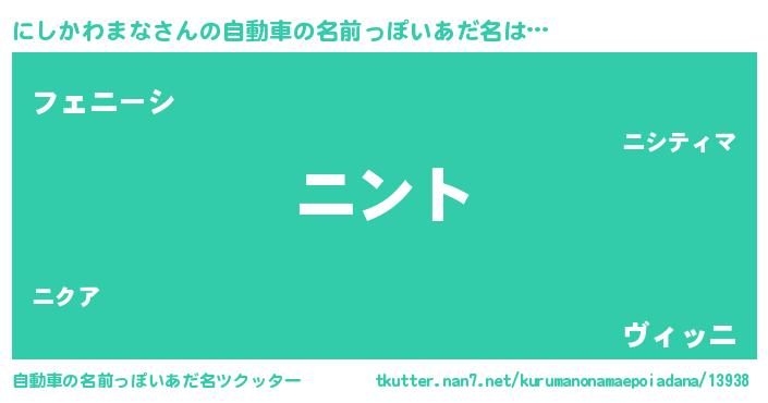 | 女子向けラノベタイトル風あだ名 | 『にしかわまなの卵を拾いまして』 |