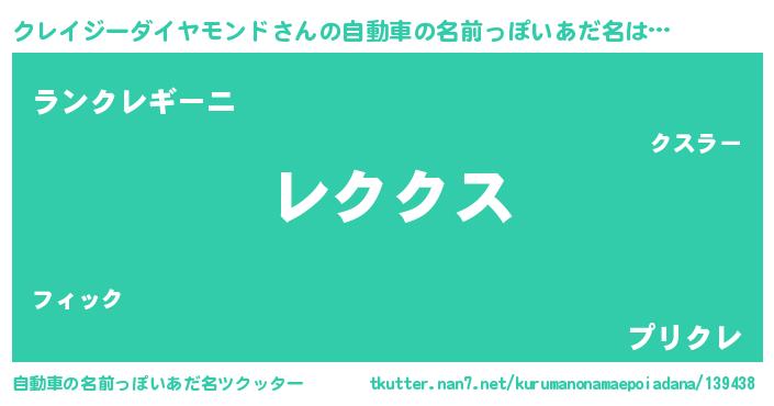 クレイジーダイヤモンドさんの自動車の名前っぽいあだ名は… 『レククス』『ランクレギーニ』『プリクレ』 ツクッター #自動車の名前っぽいあだ名ツクッター http://tkutter.nan7.net/kurumanonamaepoiadana/139438/