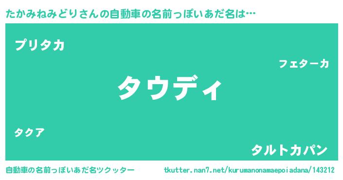 たかみねみどりさんの自動車の名前っぽいあだ名は… 『タウディ』『プリタカ』『タルトカパン』 ツクッター #自動車の名前っぽいあだ名ツクッター http://tkutter.nan7.net/kurumanonamaepoiadana/143212/