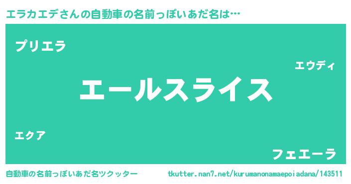 エラカエデさんの自動車の名前っぽいあだ名は… 『エールスライス』『プリエラ』『フェエーラ』 ツクッター #自動車の名前っぽいあだ名ツクッター http://tkutter.nan7.net/kurumanonamaepoiadana/143511/