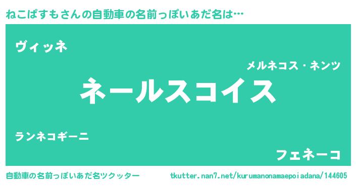 | 女子向けラノベタイトル風あだ名 | 『ねこぱすもの玉の輿計画!』 |