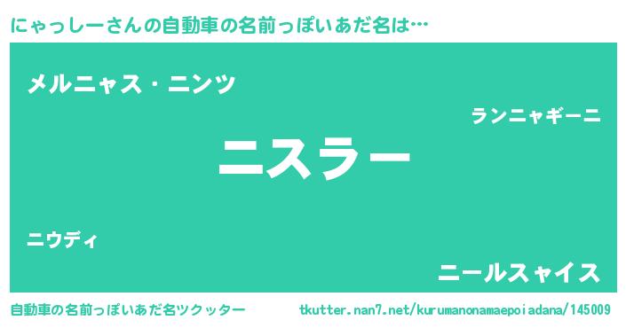 にゃっしーさんの自動車の名前っぽいあだ名は… 『ニスラー』『メルニャス・ニンツ』『ニールスャイス』 ツクッター #自動車の名前っぽいあだ名ツクッター http://tkutter.nan7.net/kurumanonamaepoiadana/145009/