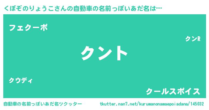 くぼぞのりょうこさんの自動車の名前っぽいあだ名は… 『クント』『フェクーボ』『クールスボイス』 ツクッター #自動車の名前っぽいあだ名ツクッター http://tkutter.nan7.net/kurumanonamaepoiadana/145032/