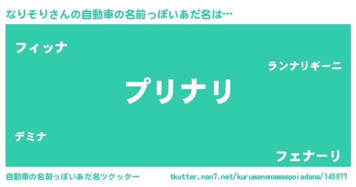 なりそりさんの自動車の名前っぽいあだ名は… 『プリナリ』『フィッナ』『フェナーリ』 ツクッター #自動車の名前っぽいあだ名ツクッター http://tkutter.nan7.net/kurumanonamaepoiadana/145977/
