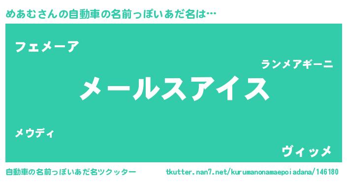 | 男性向けラノベタイトル風あだ名 | 『めあむ~年齢イコール彼女いない歴の魔法使い~』 |