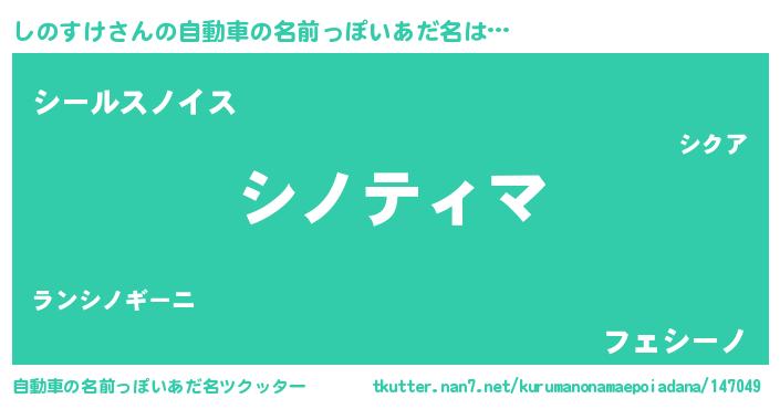 しのすけさんの自動車の名前っぽいあだ名は… 『シノティマ』『シールスノイス』『フェシーノ』 ツクッター #自動車の名前っぽいあだ名ツクッター http://tkutter.nan7.net/kurumanonamaepoiadana/147049/
