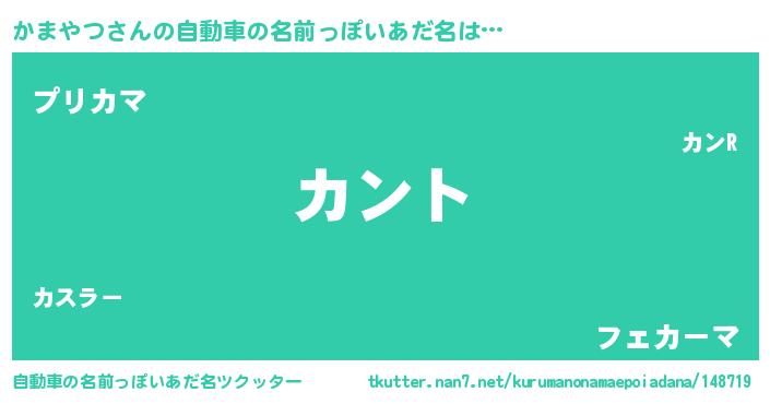 かまやつさんの自動車の名前っぽいあだ名は… 『カント』『プリカマ』『フェカーマ』 ツクッター #自動車の名前っぽいあだ名ツクッター http://tkutter.nan7.net/kurumanonamaepoiadana/148719/