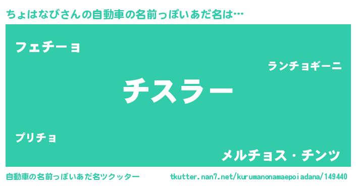 ちょはなびさんの自動車の名前っぽいあだ名は… 『チスラー』『フェチーョ』『メルチョス・チンツ』 ツクッター #自動車の名前っぽいあだ名ツクッター http://tkutter.nan7.net/kurumanonamaepoiadana/149440/