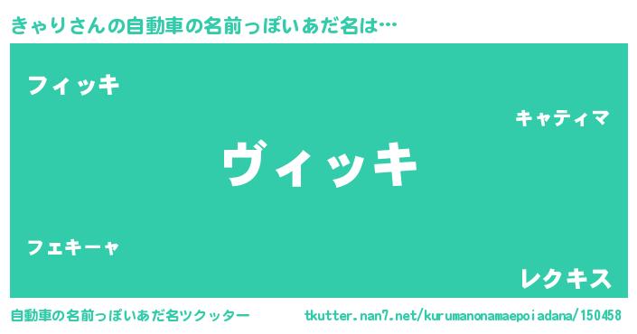 きゃりさんの自動車の名前っぽいあだ名は… 『ヴィッキ』『フィッキ』『レクキス』 ツクッター #自動車の名前っぽいあだ名ツクッター http://tkutter.nan7.net/kurumanonamaepoiadana/150458/