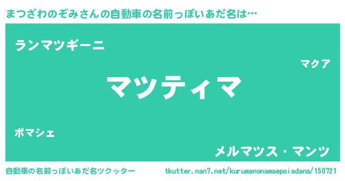 まつざわのぞみさんの自動車の名前っぽいあだ名は… 『マツティマ』『ランマツギーニ』『メルマツス・マンツ』 ツクッター #自動車の名前っぽいあだ名ツクッター http://tkutter.nan7.net/kurumanonamaepoiadana/150721/