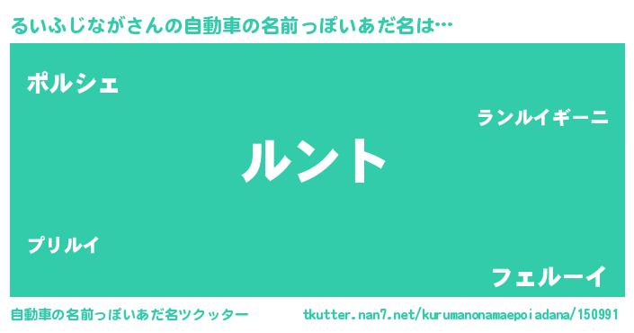 るいふじながさんの自動車の名前っぽいあだ名は… 『ルント』『ポルシェ』『フェルーイ』 ツクッター #自動車の名前っぽいあだ名ツクッター http://tkutter.nan7.net/kurumanonamaepoiadana/150991/