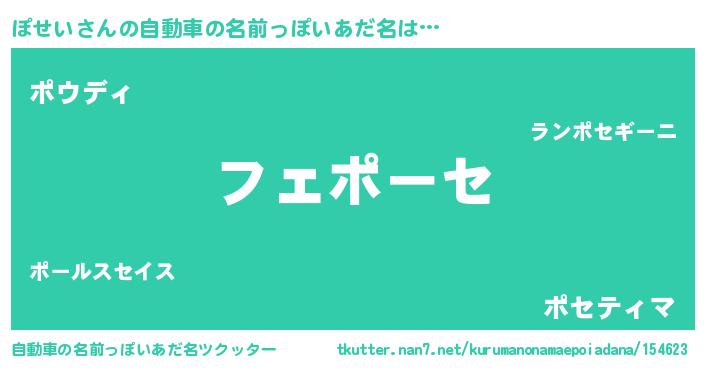 ぽせいさんの自動車の名前っぽいあだ名は… 『フェポーセ』『ポウディ』『ポセティマ』 ツクッター #自動車の名前っぽいあだ名ツクッター http://tkutter.nan7.net/kurumanonamaepoiadana/154623/