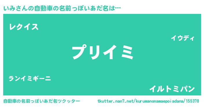 いみさんの自動車の名前っぽいあだ名は… 『プリイミ』『レクイス』『イルトミパン』 ツクッター #自動車の名前っぽいあだ名ツクッター http://tkutter.nan7.net/kurumanonamaepoiadana/155378/
