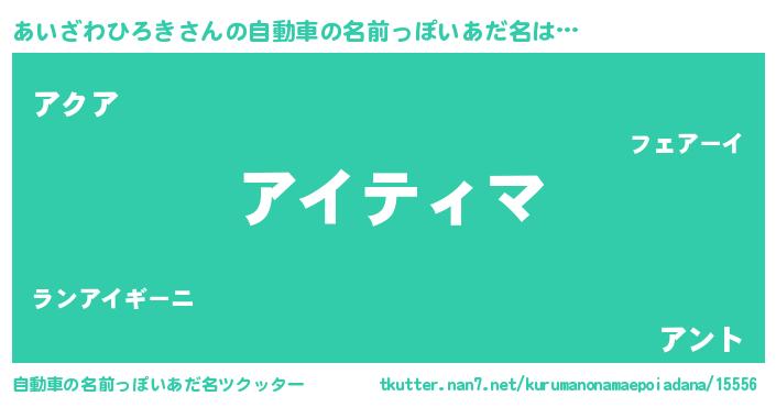 あいざわひろきさんの自動車の名前っぽいあだ名は… 『アイティマ』『アクア』『アント』 ツクッター #自動車の名前っぽいあだ名ツクッター http://tkutter.nan7.net/kurumanonamaepoiadana/15556/