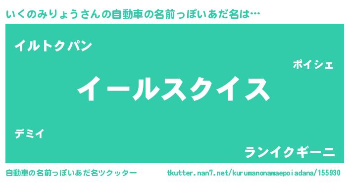 いくのみりょうさんの自動車の名前っぽいあだ名は… 『イールスクイス』『イルトクパン』『ランイクギーニ』 ツクッター #自動車の名前っぽいあだ名ツクッター http://tkutter.nan7.net/kurumanonamaepoiadana/155930/