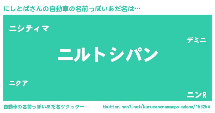 にしとばさんの自動車の名前っぽいあだ名は… 『ニルトシパン』『ニシティマ』『ニンR』 ツクッター #自動車の名前っぽいあだ名ツクッター http://tkutter.nan7.net/kurumanonamaepoiadana/156254/