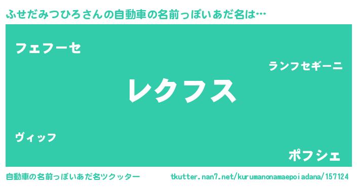 ふせだみつひろさんの自動車の名前っぽいあだ名は… 『レクフス』『フェフーセ』『ポフシェ』 ツクッター #自動車の名前っぽいあだ名ツクッター http://tkutter.nan7.net/kurumanonamaepoiadana/157124/