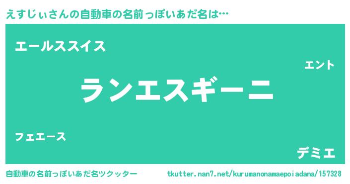 えすじぃさんの自動車の名前っぽいあだ名は… 『ランエスギーニ』『エールススイス』『デミエ』 ツクッター #自動車の名前っぽいあだ名ツクッター http://tkutter.nan7.net/kurumanonamaepoiadana/157328/