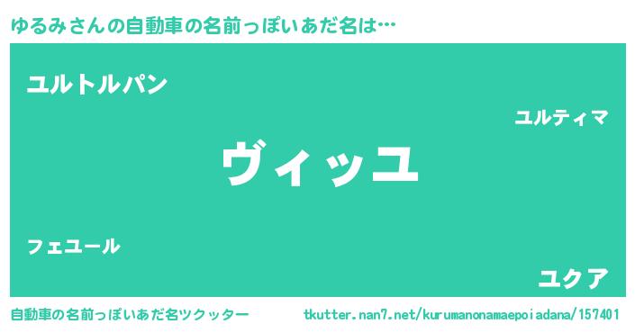 ゆるみさんの自動車の名前っぽいあだ名は… 『ヴィッユ』『ユルトルパン』『ユクア』 ツクッター #自動車の名前っぽいあだ名ツクッター http://tkutter.nan7.net/kurumanonamaepoiadana/157401/