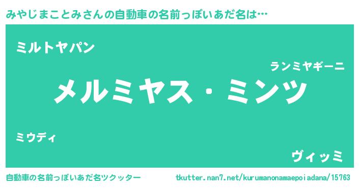 みやじまことみさんの自動車の名前っぽいあだ名は… 『メルミヤス・ミンツ』『ミルトヤパン』『ヴィッミ』 ツクッター #自動車の名前っぽいあだ名ツクッター http://tkutter.nan7.net/kurumanonamaepoiadana/15763/