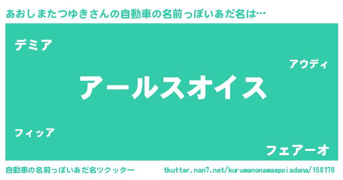 あおしまたつゆきさんの自動車の名前っぽいあだ名は… 『アールスオイス』『デミア』『フェアーオ』 ツクッター #自動車の名前っぽいあだ名ツクッター http://tkutter.nan7.net/kurumanonamaepoiadana/158170/