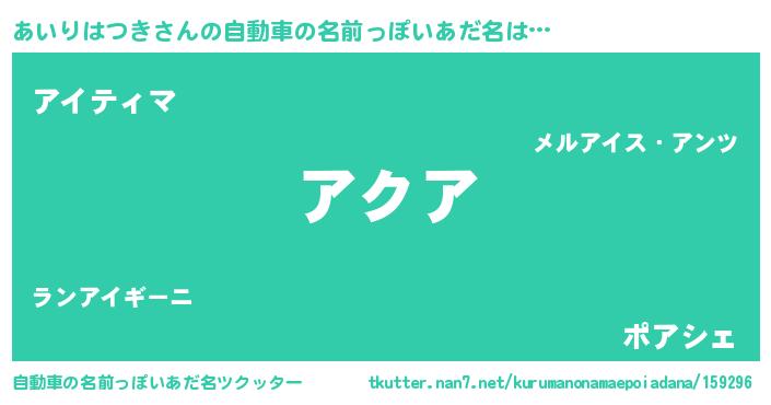 あいりはつきさんの自動車の名前っぽいあだ名は… 『アクア』『アイティマ』『ポアシェ』 ツクッター #自動車の名前っぽいあだ名ツクッター http://tkutter.nan7.net/kurumanonamaepoiadana/159296/