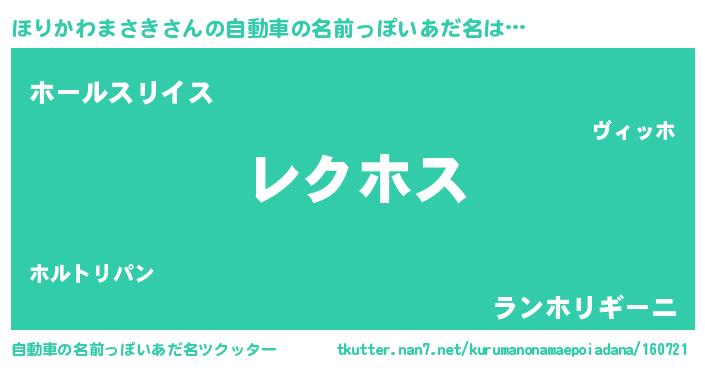ほりかわまさきさんの自動車の名前っぽいあだ名は… 『レクホス』『ホールスリイス』『ランホリギーニ』 ツクッター #自動車の名前っぽいあだ名ツクッター http://tkutter.nan7.net/kurumanonamaepoiadana/160721/