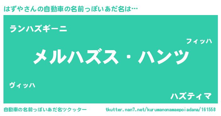 はずやさんの自動車の名前っぽいあだ名は… 『メルハズス・ハンツ』『ランハズギーニ』『ハズティマ』 ツクッター #自動車の名前っぽいあだ名ツクッター http://tkutter.nan7.net/kurumanonamaepoiadana/161558/